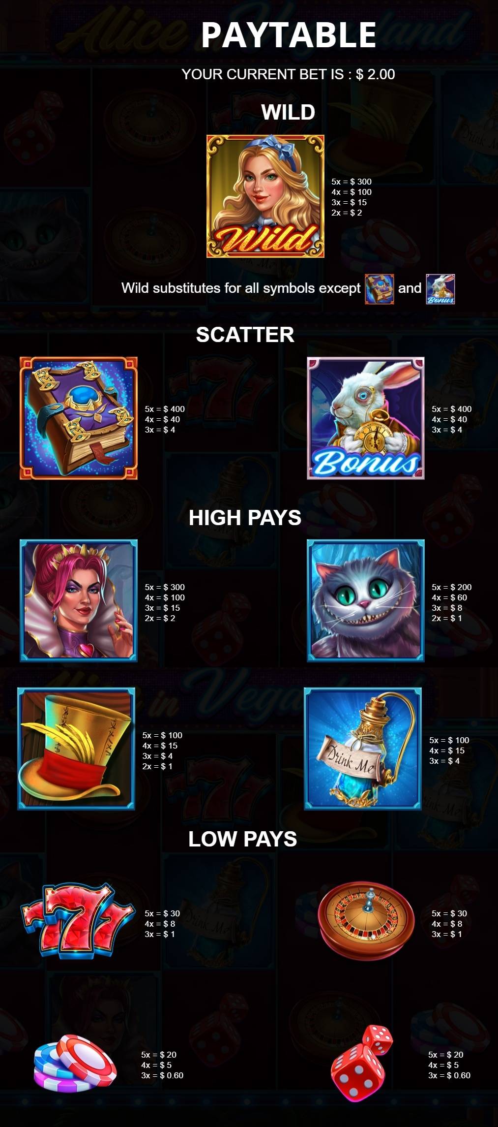 Experience the Alice in Vegasland slot online for free in demo mode. No download required to enjoy this thrilling game. Full game details, image gallery, and video demonstration included.
