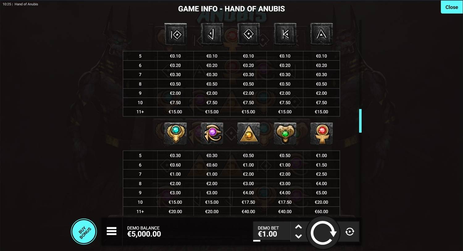 | Wild | The Eye of Horus | 12.5x | Substitutes for all symbols except Scatter and Anubis Scarab. |