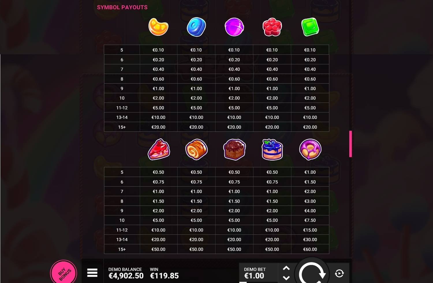 Experience the Tasty Treats slot online for free in demo mode. No download required to enjoy this thrilling game. Full game details, image gallery, and video demonstration included.